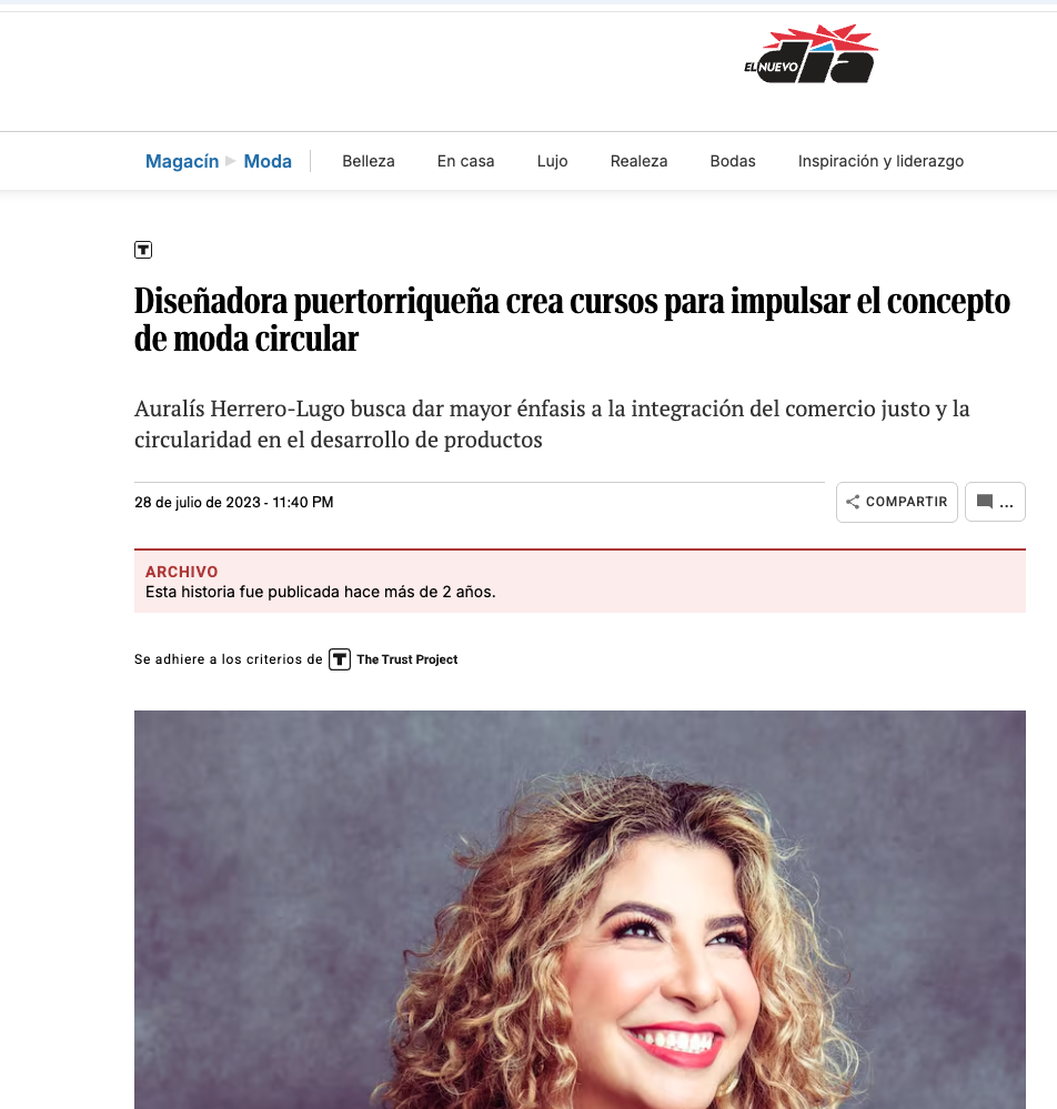 Hi! I am Auralis Herrero Lugo, leading this studio, a hub for my circular fashion and manufacturing consultancy. It features an online school where I offer three master classes in sustainable product development, circularity, and fair trade and a monthly newsletter in English and Spanish. The studio also houses a historical archive of my fashion design work and my client portfolio.